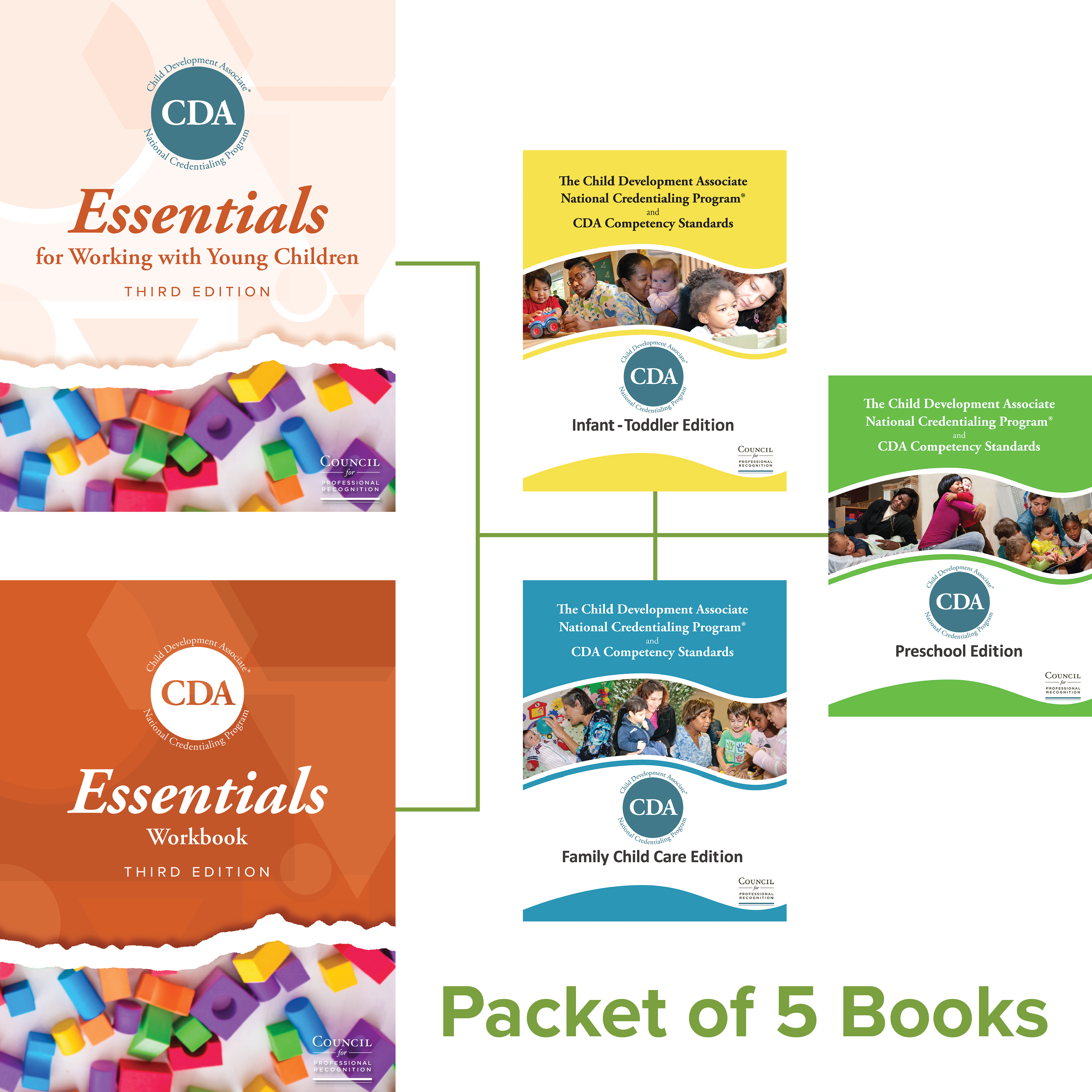BEST OFFER! Calling all CDA instructors and trainers, the combo you've been waiting for is here. Start the school year with the tools you need to help your students successfully earn the CDA credential in all settings. The CDA Trainer's Super Bundle comes complete with our top five books: (1) Essentials for Working with Young Children textbook; (2) Essentials Workbook; (3) CDA Competency Standards book: Infant-Toddler Edition; (4) CDA Competency Standards book: Preschool Edition; and (5) CDA Competency Standards book: Family Child Care Edition. This bundle has EVERYTHING YOU NEED to prepare your students for a career in early childhood education.